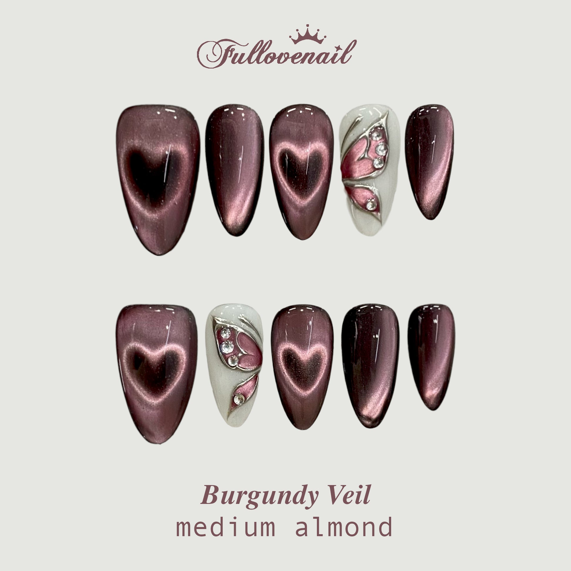 Deep burgundy tones are layered with a soft, velvety sheen, accented by sculpted heart details and delicate botanical touches in muted neutrals. The palette feels rich yet controlled — paired with subtle contrasts that add depth and intrigue without tipping into drama.