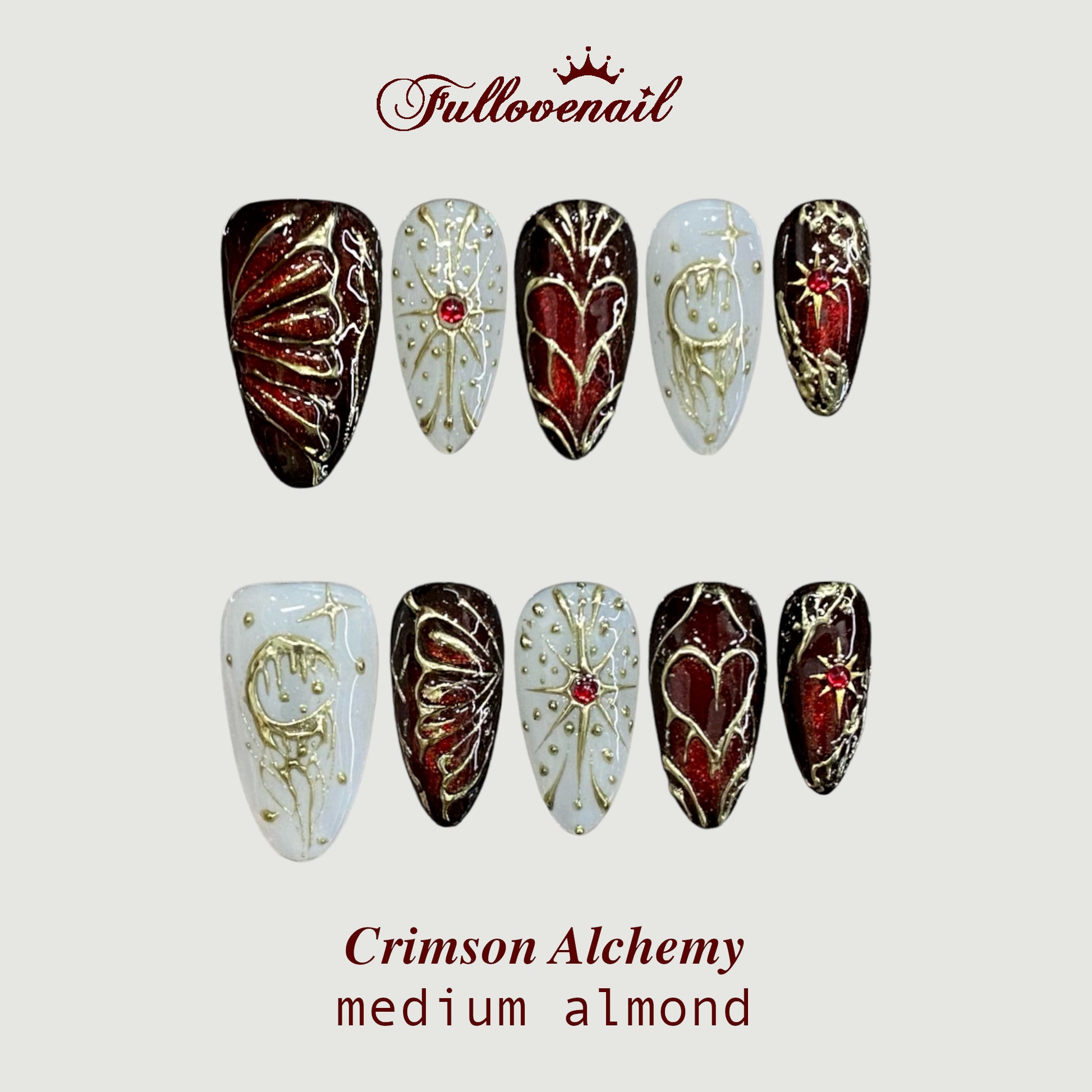A hypnotic blend of deep, shimmering crimson pairs with a starlight white. It is traced with molten gold celestial motifs—drifting moons and sunbursts—then touched with piercing ruby gems that seem to glow from within. The visual effect is ornate yet dreamily ethereal.