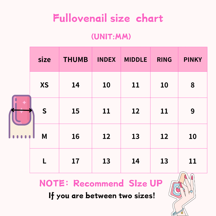 Hold the measuring tape horizontally across the widest part of your natural nail (in millimeters) and note the size for each nail. Need help? Slide into our DMs on Tiktok @Fullovenail or email Support@Fullovenail.com!