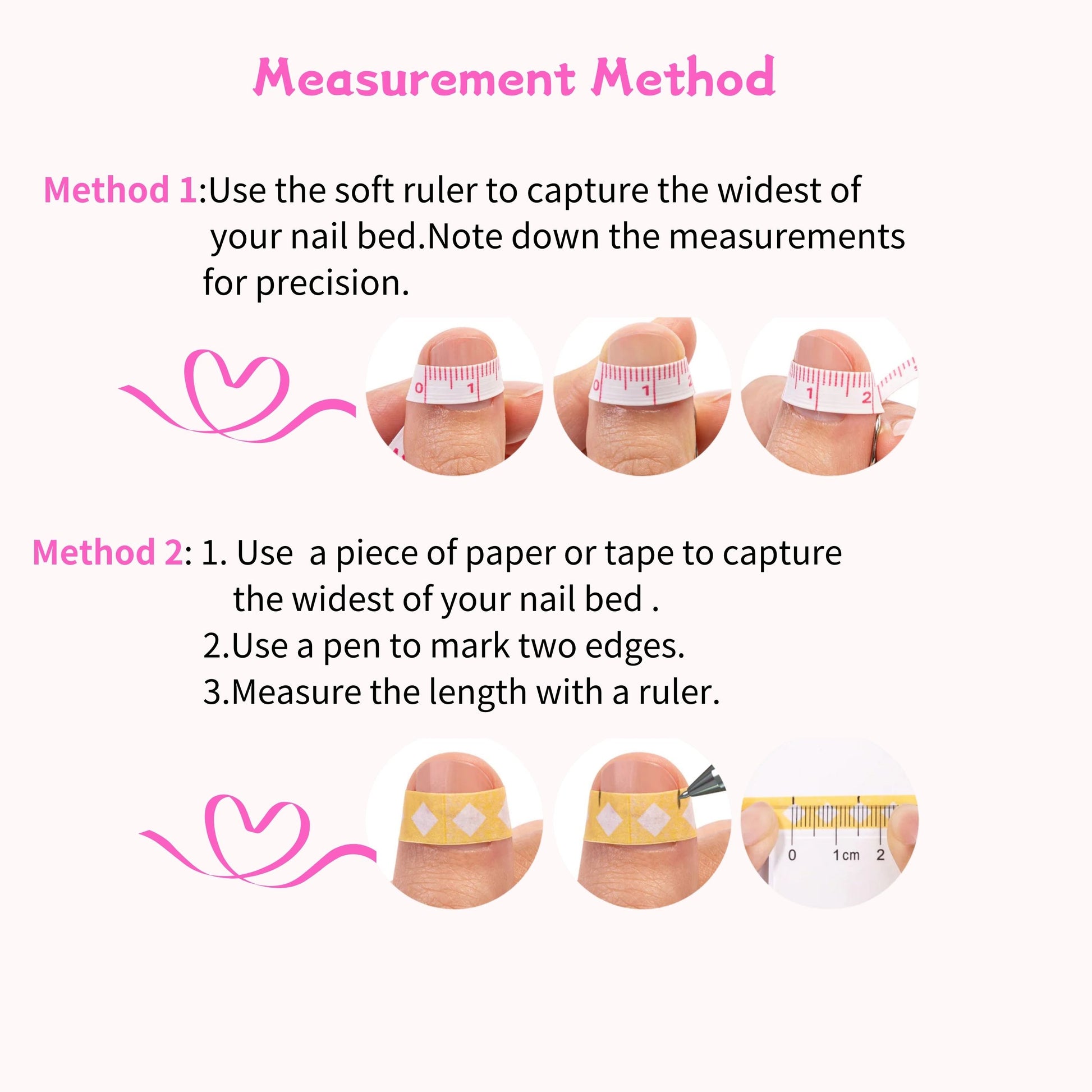 2. Measure & Match: Use the included measuring tape to find the perfect fit for each nail.