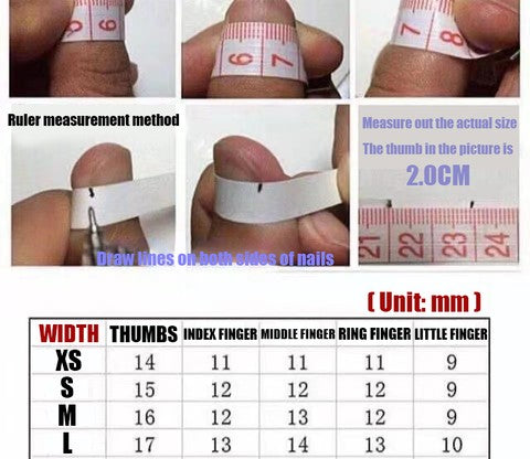 Hold the measuring tape horizontally across the widest part of your natural nail (in millimeters) and note the size for each nail. Need help? Slide into our DMs on Tiktok @Fullovenail or email Support@Fullovenail.com!