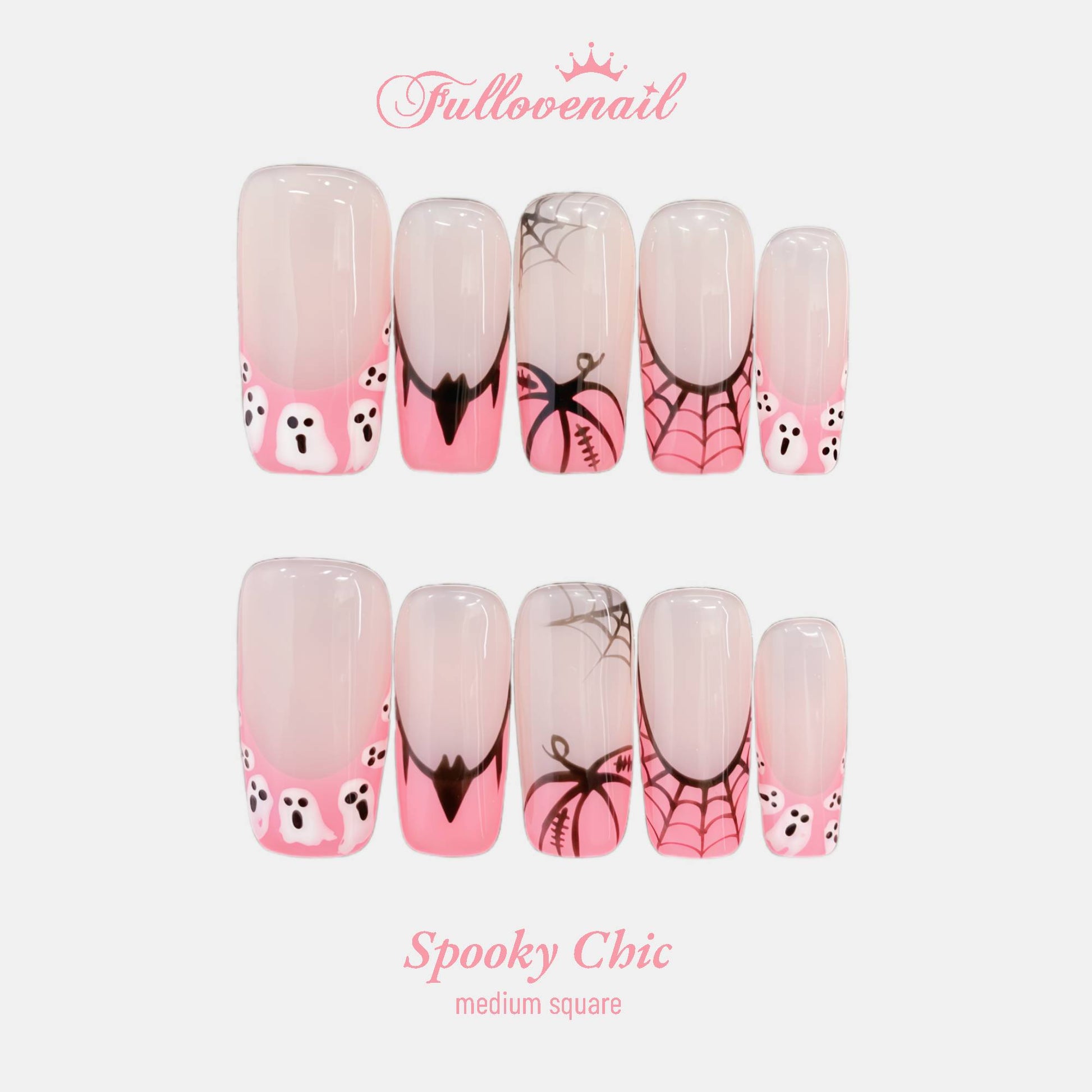 A glossy nude base meets vibrant bubblegum pink tips, offering a fresh departure from the traditional dark palette. Tiny, floating ghosts are layered with delicate black spiderwebs and bat silhouettes, paired with a stylized pumpkin motif that keeps the look polished and playful.